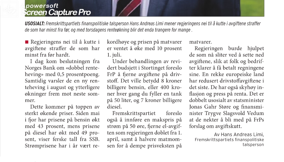 Det er lett å være kritisk til dagens regjering med tanke på miljø, klima og en rekke andre saker, men når det gjelder når det gjelder Fremskrittspartiets Hans Andre Limi sin kritikk av regjeringen i Fanaposten fredag den 24 juni får meg virkelig til å lure på hvilken idelogi FrP egentlig har. I det ene sekundet er totalt markedsliberalister og vil at markedet skal styre alt, men i det andre så vil de at staten skal bry seg inn for å hindre at prisene løper løpsk.